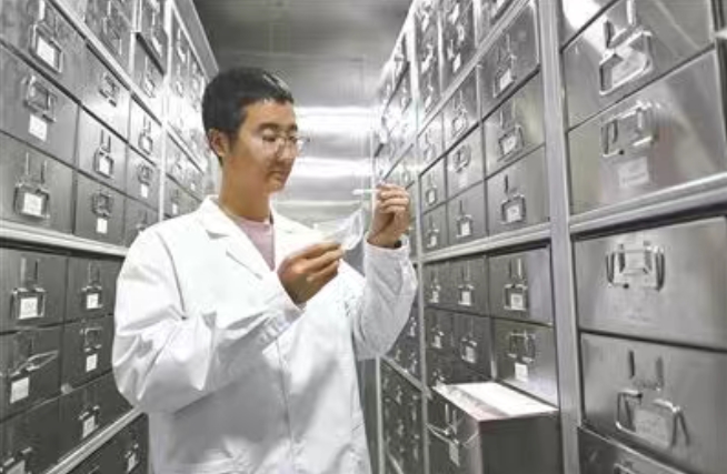 博士后张猛在全球最大的乳酸菌种质资源库查看乳酸菌菌株。
