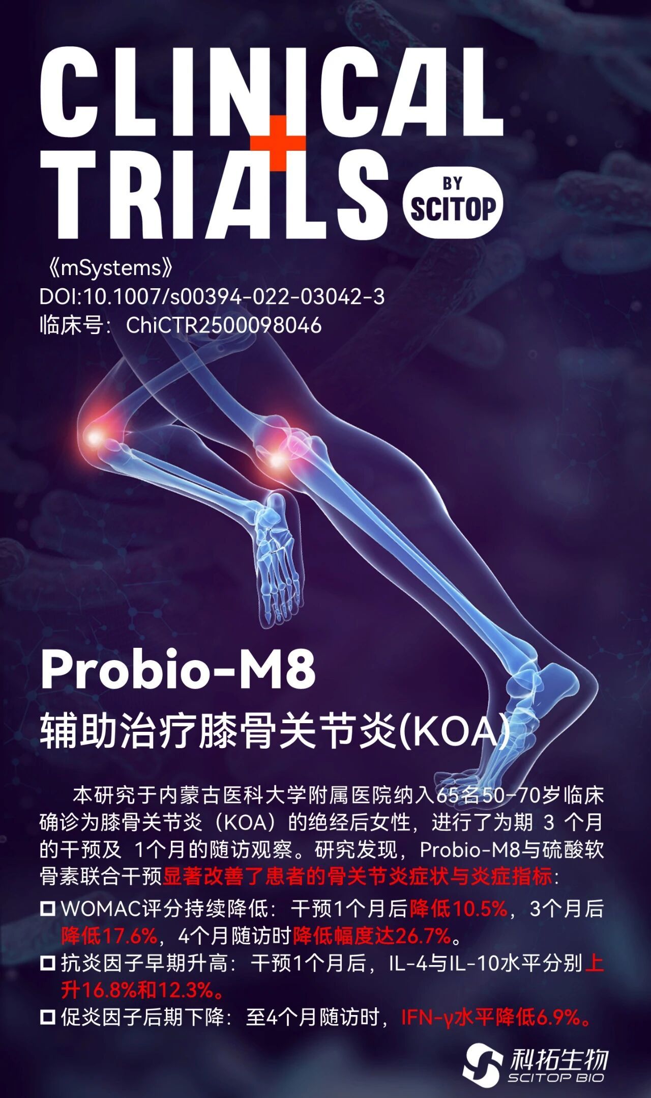 膝骨关节炎(KOA)的发病机制及其表型表达与人类肠道微生物群有关。Probio-M8在与硫酸软骨素联合使用时,被证实可通过调节“肠 - 关节轴”增强KOA治疗效果,显著改善关节症状及炎症状态,此项研究成果已发表于《mSystems》。