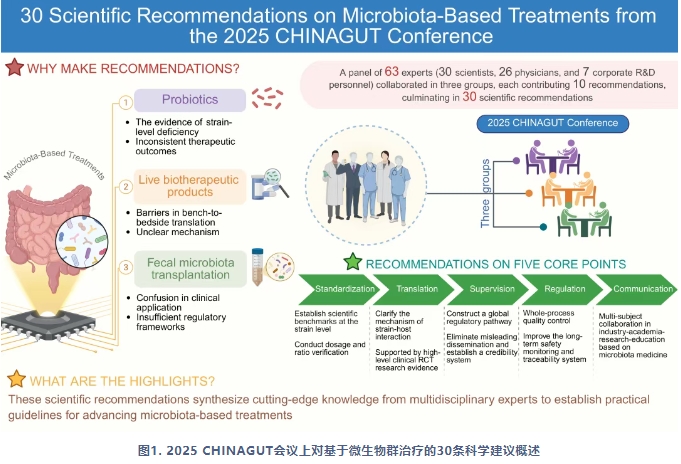 基于微生物组的医疗健康产业发展已成为全球公认的跨学科前沿领域,在感染性疾病、炎症性疾病及多器官免疫相关疾病等系统性疾病防治领域展现出变革性潜力。过去十年间,益生菌科学与产业、活体生物药(LBPs)及粪菌移植(FMT)转化应用已引发全球广泛关注。2025中国肠道大会期间,领域专家小组正式发布30条科学建议,全面推动这些领域的可持续转化与产业发展(图1)。