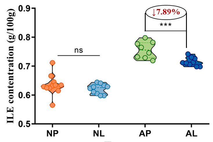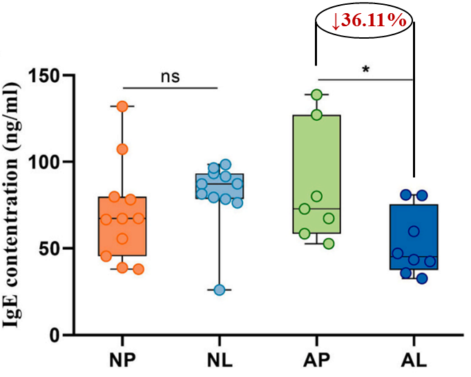 LC-Zhang通过调节过敏人群肠道菌群的氨基酸代谢,显著降低肠道中异亮氨酸(食物过敏潜在风险因子)水平(↓7.89%)并使其趋近非过敏人群(P<0.05)。同时下调血清中关键过敏标志物IgE(↓36.11%)和组胺的浓度(P<0.05),增强肠道中黏膜免疫保护分子 SIgA 的产生,还能针对性下调Th2 型细胞因子 IL-4(P<0.05)、抑制促炎因子 IL-6。LC-Zhang通过抑制 Th2 活化修复 Th1/Th2 免疫失衡,最终重塑过敏人群的免疫因子模式使其更接近非过敏人群,从而特异性维持免疫稳态、缓解食物过敏。